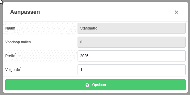 Zet het veld Volgorde (eerste volgnummer) op 1, zodat de nummering start bij 20261.
